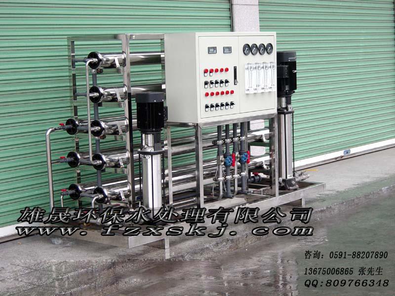 2反渗透装置:膜的分离孔径在10-6cm-10-7cm,能除去水中有机物(如三卤甲烷中间体、胶体、悬浮物、微生物、细菌、藻类、霉类等)、热源、病毒等物质,流体经前三级预处理后的水经反渗透RO膜主机深层分离处理后,使有益于人体健康的水通过,不利于人体健康的水排除,脱盐率98%,生产出纯净水进入纯水箱;(根据具体情况,膜过滤分一级或二级反渗透处理)。一个良好系统设计可保证整个系统在3年内不用更换膜元件(使用寿命与水源水质有关);在线电导率显示仪,随时动态显示净水生产的水质状态。高压泵,提供膜透过水的工作压力。保持产水率。分一级或二级高压泵加压渗透处理。本套水处理系统为双级反渗透系统。